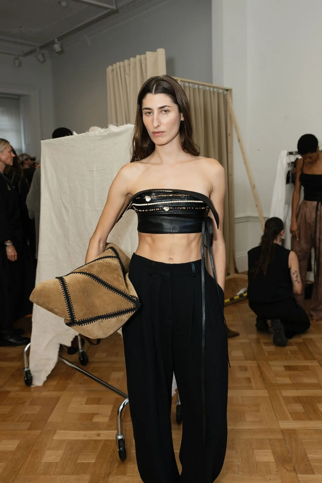 Founder and Creative Director Sandra Sándor designed the collection to reflect on the brand's 20th-anniversary era and its continued evolution in luxury, as noted in the SS25/SS26 season transitions. The show highlighted a balance of organic form and function, featuring twisted, folded, and draped garments, along with fabric blocking (pairing slip satin with mesh jersey) and the use of their signature leather.